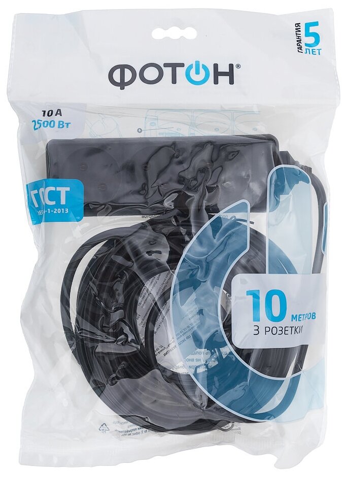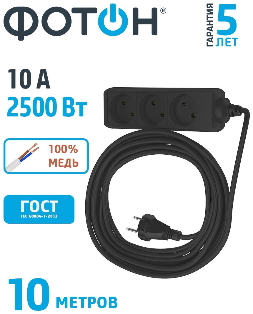 Сетевой удлинитель Фотон 10-103, 10м, 10А, 3 розетки без заземления, черный, 1 шт. информация: