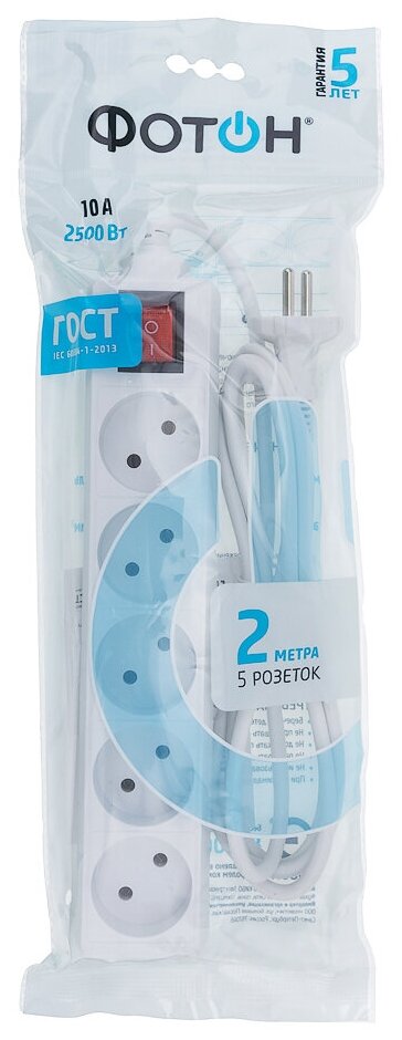 Фотон Удлинитель сетевой 10-25S, 2м, 5 розеток, 10А, Белый 21117 . информация: