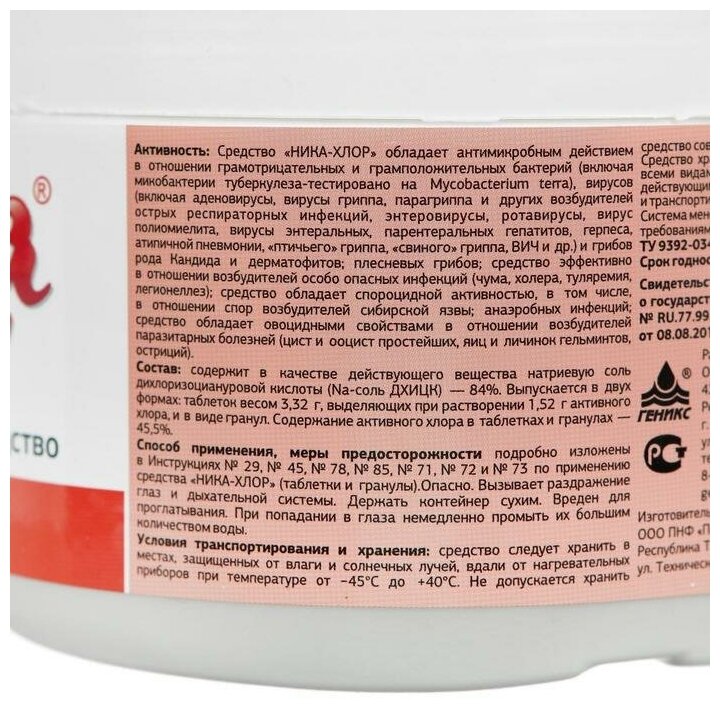 Дезинфицирующее средство Ника "Хлор", 100 таб., 0,3 кг (арт. 279924) информация: