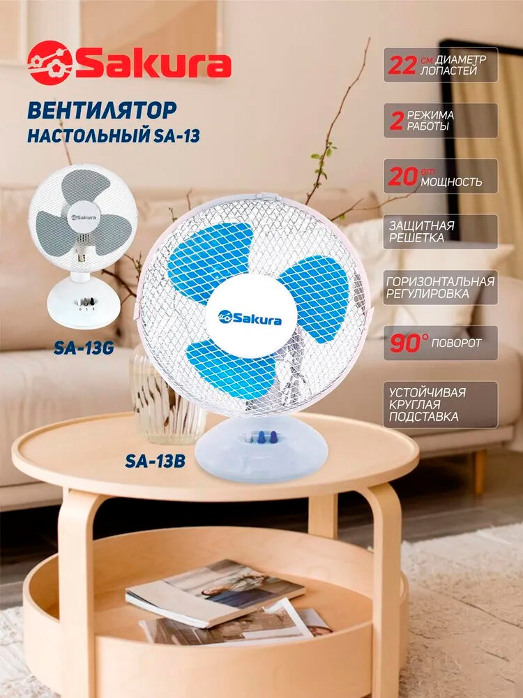 Настольный вентилятор Sakura SA-13 (SA-13B), белый/синий