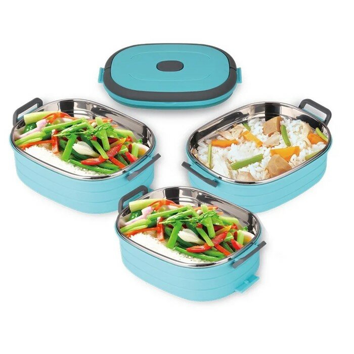 Lunch Box с тремя термо-контейнерами герметичными металл. отделениями для еды, супа, с термо-сумкой для школы 1.4л. Сталь внутри