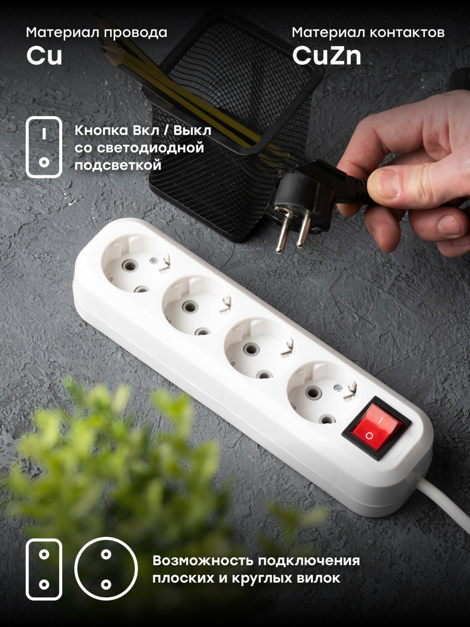Удлинитель бытовой с выключателем и заземлением, 4 розетки, 3 метра, Эксперт (16А-3,5кВт, ПВС)
