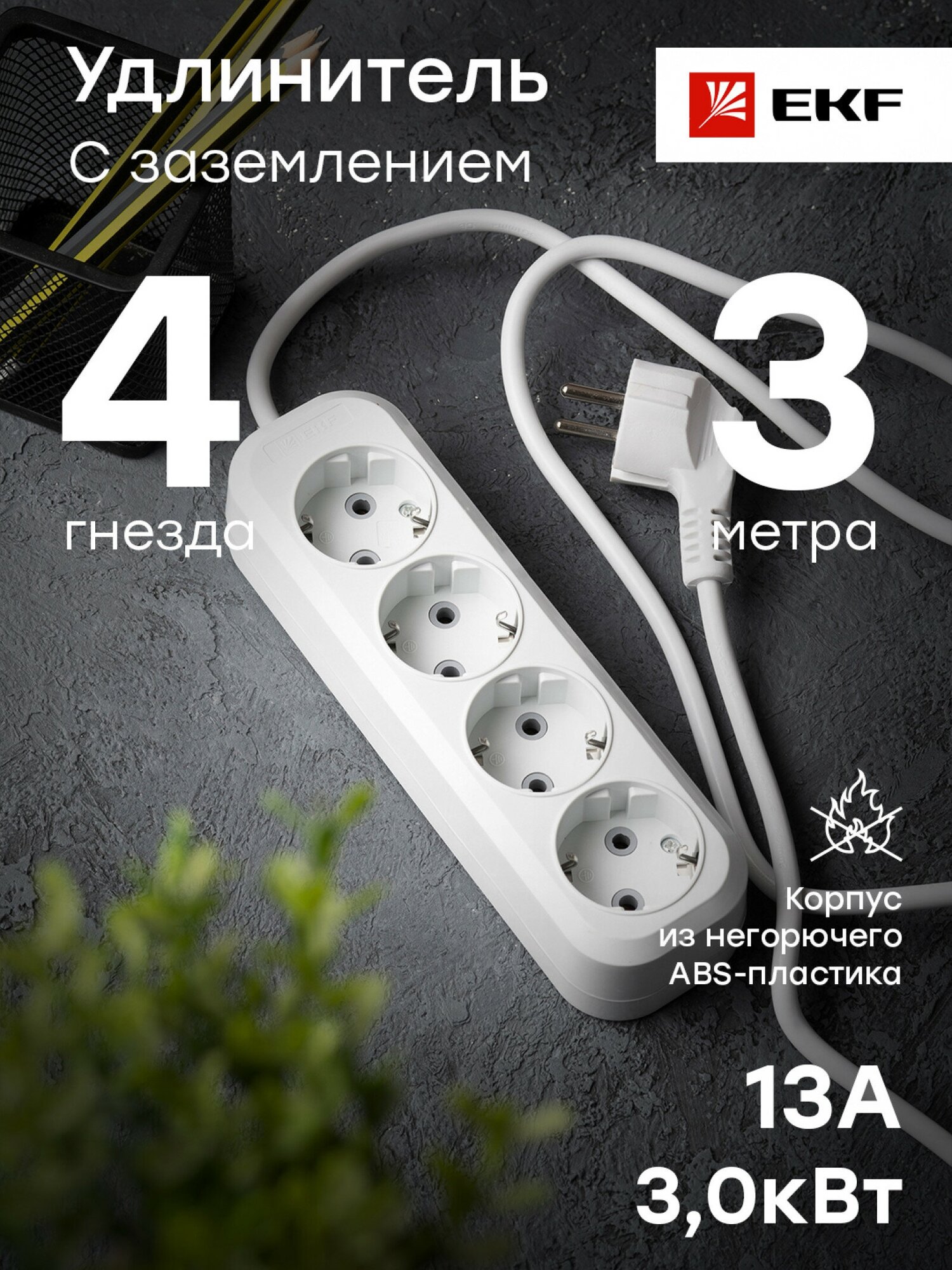 Удлинитель Эксперт 4 гнезда 3 метра 13А-3,0кВт с заземлением ПВС 3х1 EKF PROxima информация:
