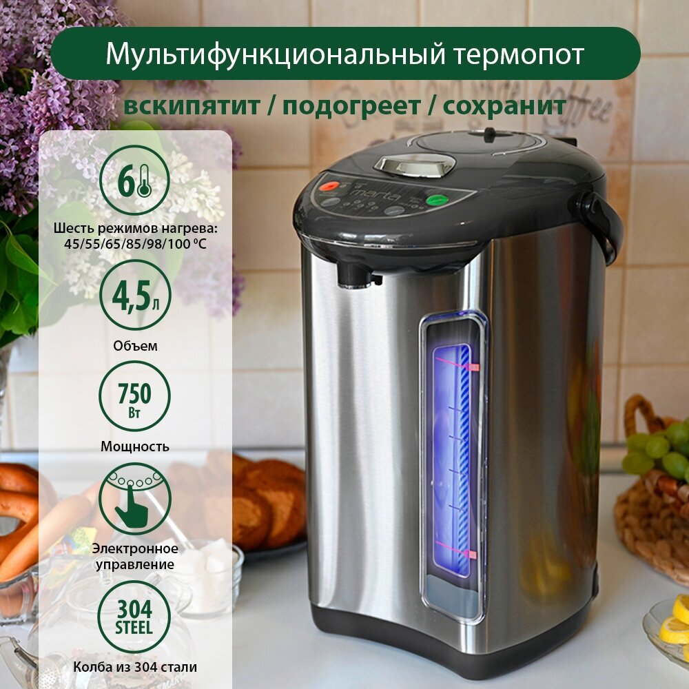 Термопот Marta MT-1999 черный жемчуг кипячение - 750 Вт, подогрев - 30 Вт, емкость 4,5Л, 304 сталь, .