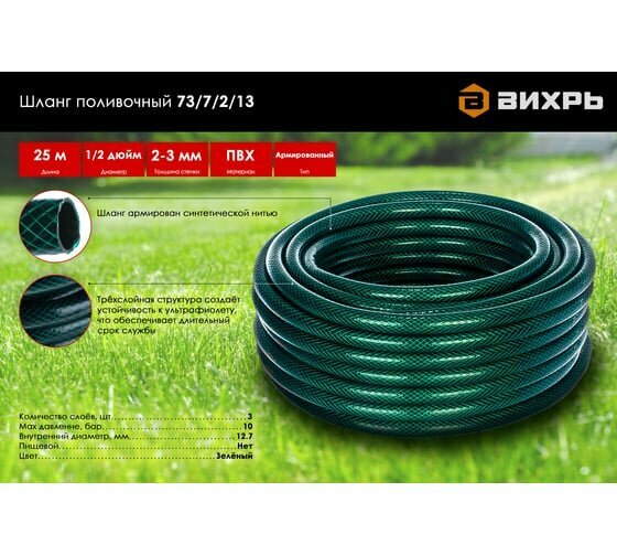 10 цен на Шланг поливочный ПВХ трехслойн. армир. 1/2 25м зел. Вихрь 73/7/2/13