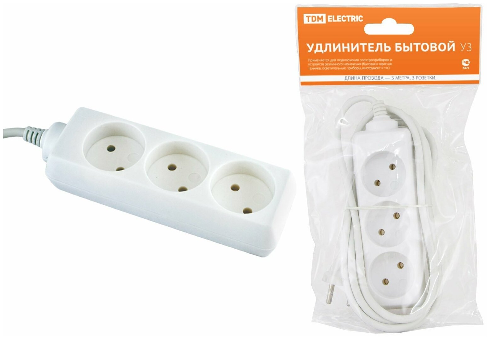 Отзывы на Удлинитель TDM У3 3 гнезда 3 метра без заземляющих контактов ПВС 2х0,75 SQ1303-0201 (20 шт.)