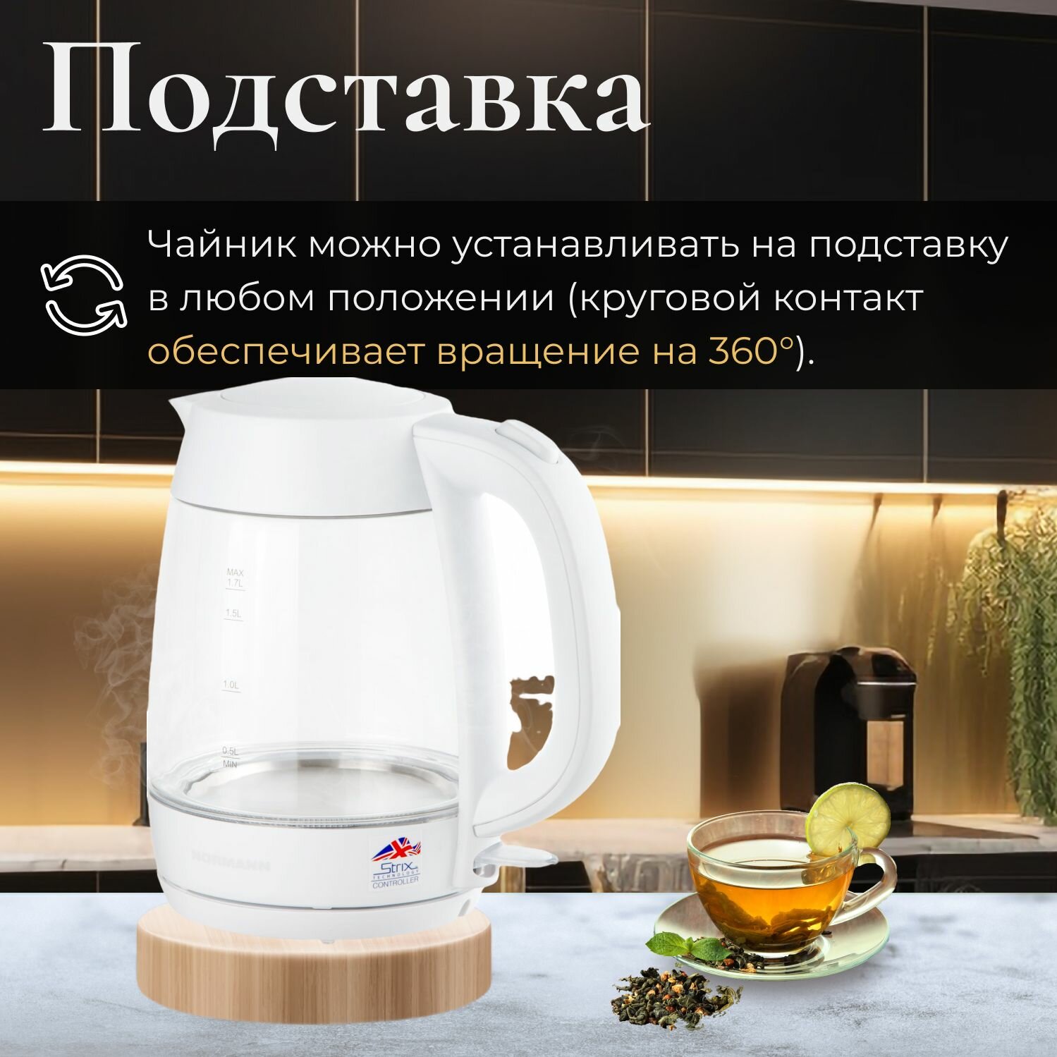 Чайник электрический AKL-242 NORMANN (2200 Вт, 1,7 л, стекло, подсветка, контактная группа Strix) информация: