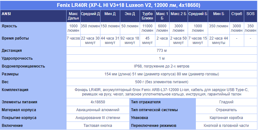 Фонарь Fenix LR40R V2.0 15000 Lumen информация: