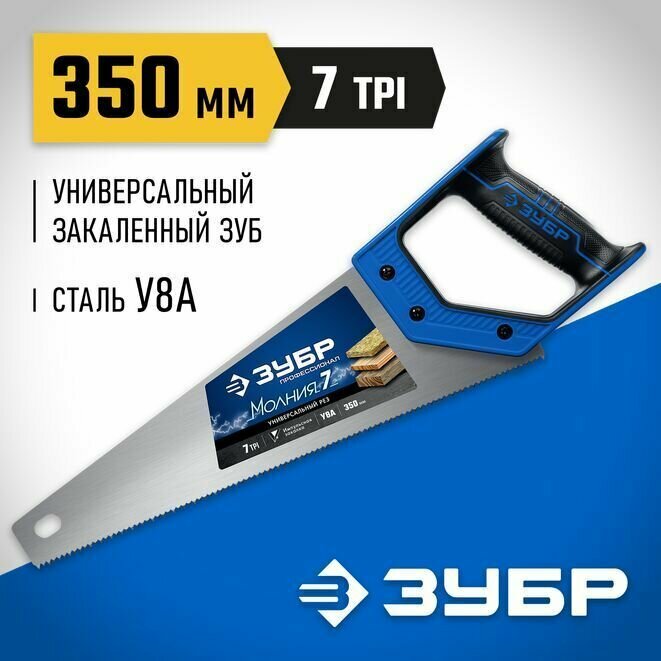Ножовка универсальная (пила) ?МОЛНИЯ-7? 350 мм, 7 TPI, закалка, рез вдоль и поперек волокон, для средних заготовок, фанеры, ДСП, МДФ, ЗУБР информация: