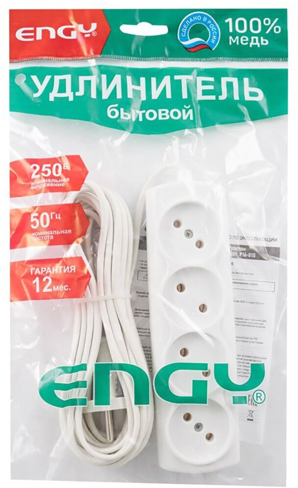 Удлинитель Engy Премиум 4 розетки, 4 розетки, б/з, 10А / 2300 Вт