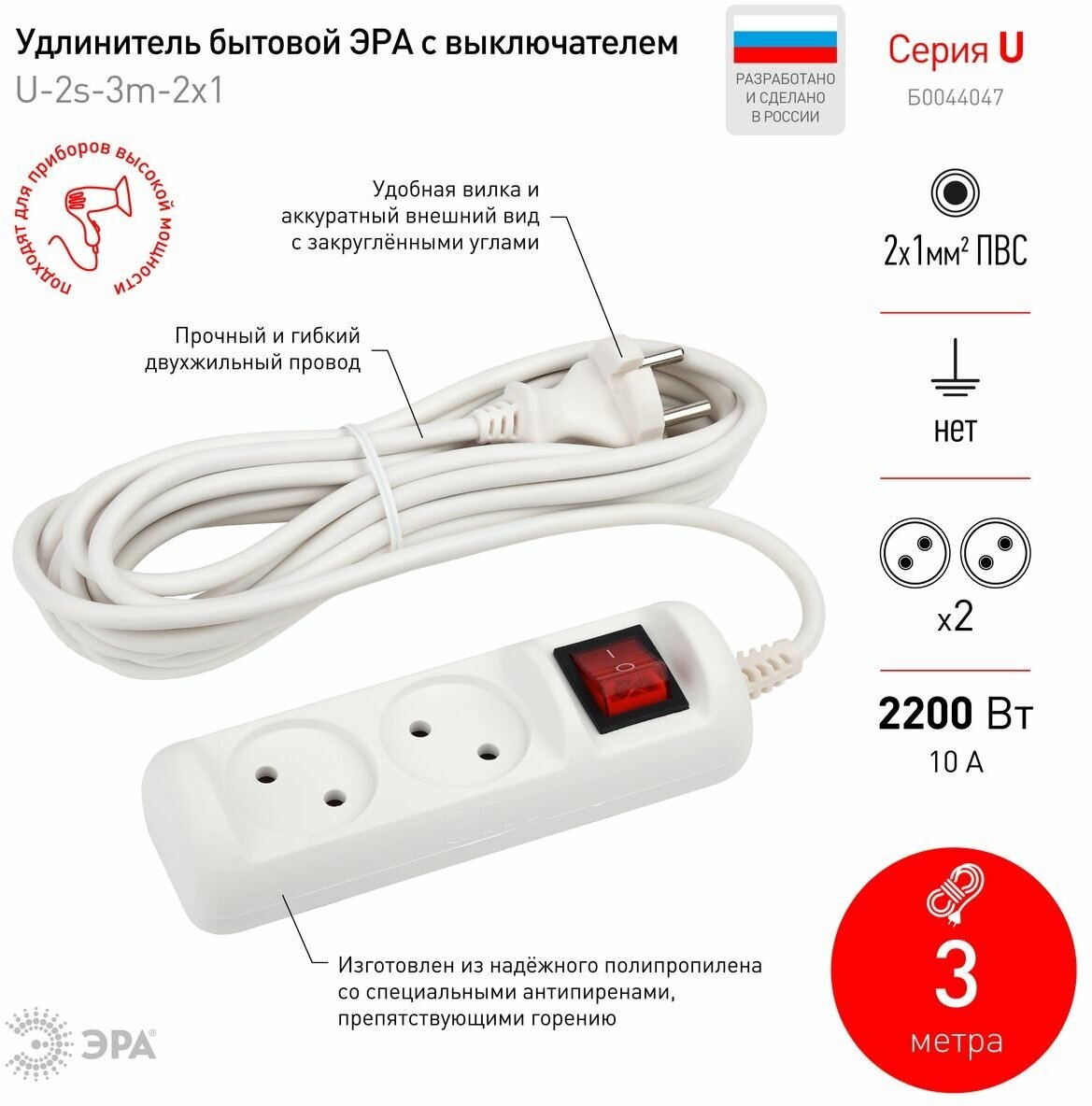 Удлинитель электрический ЭРА U-2s-3m-2x1 без заземления c выключателем 2 розетки 3м ПВС 2x1мм² 10А арт. Б0044047 (1 шт.)
