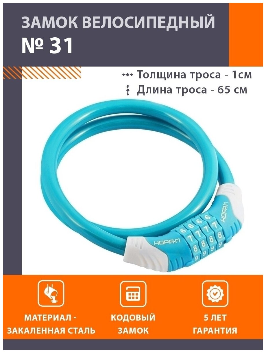 Замок велосипедный кодовый Нора-М №31 10x650 (противоугонный, стальной трос 10мм, длина 65см) - Голубой