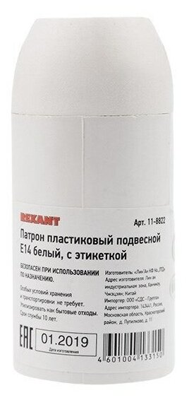 Патрон E14 пластиковый термостойкий подвесной бел. с этикеткой Rexant 11-8822 информация: