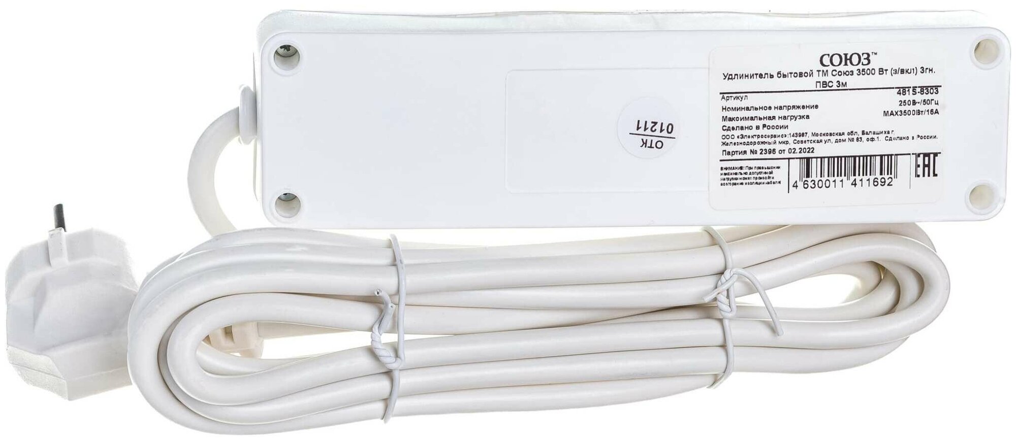 Удлинитель Союз 481S-8303, 3 розетки, с/з, 16А / 3500 Вт белый 3 м информация: