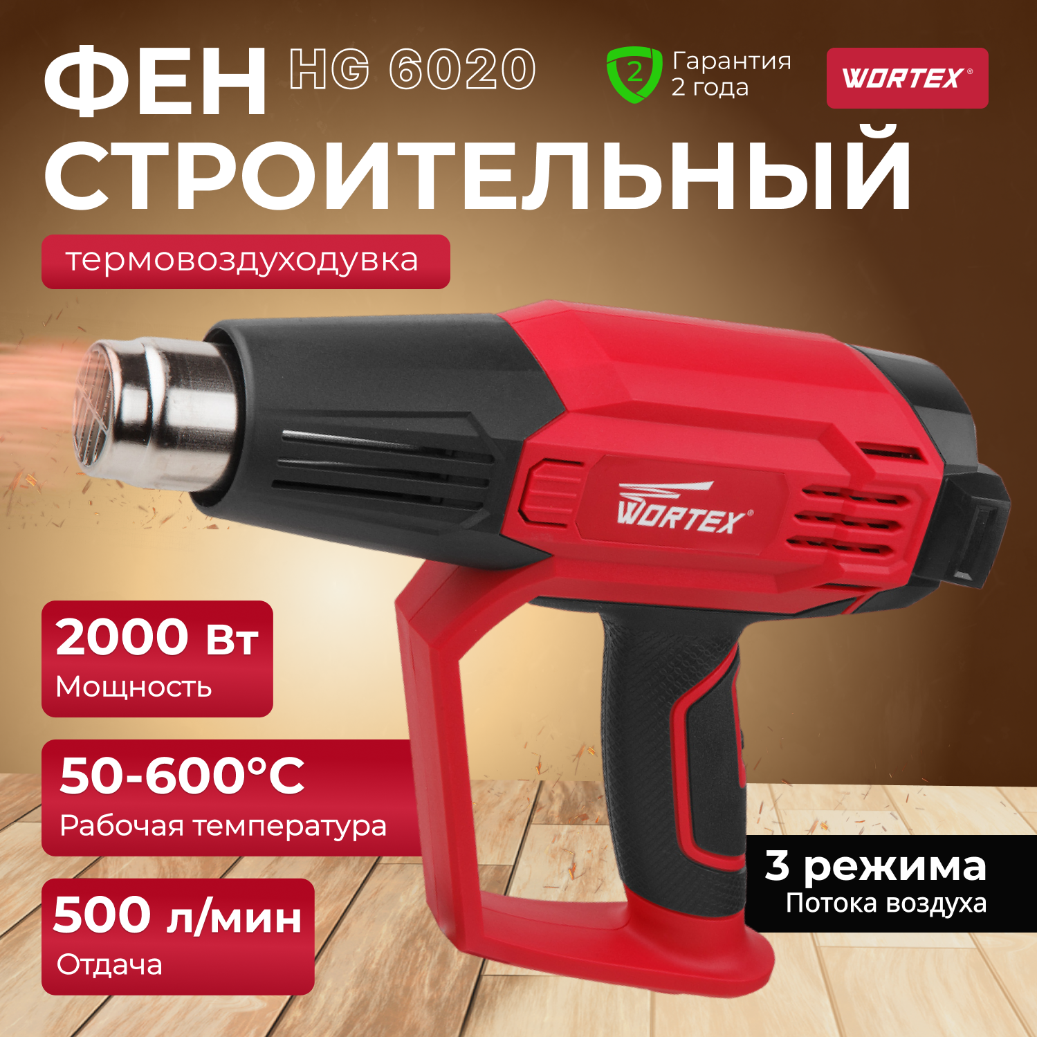 Wortex Термовоздуходувка WORTEX HG 6020 в кор. + набор сопл (2000 Вт, 2 скор., 450-600 °С, ступенч. рег.,250-500 л/мин) (HG602000011)