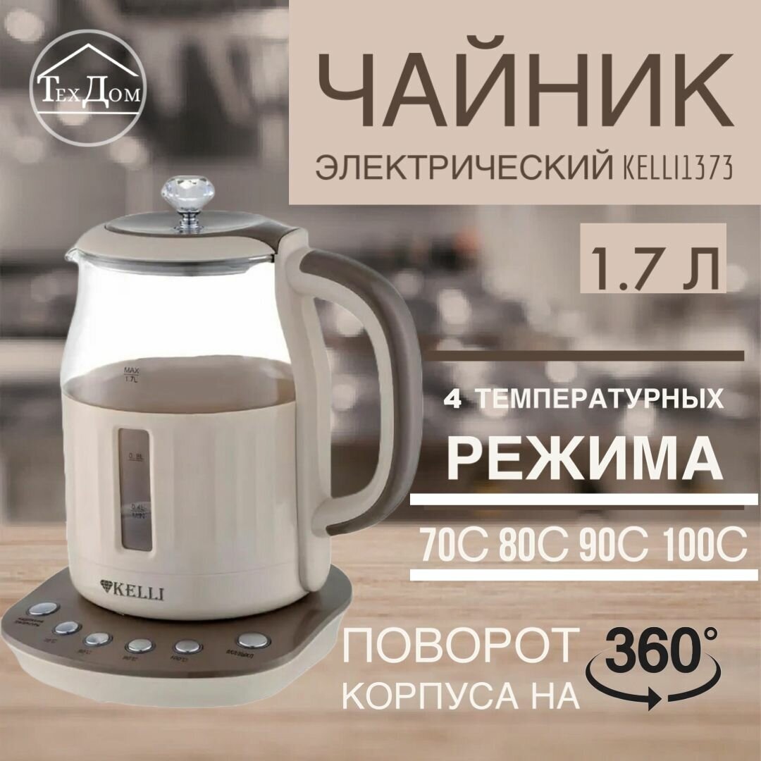 Чайник электрический Kelli KL-1373 / 1.7 л / 2200 Вт / 4 температурных режима / стекло / кофейный