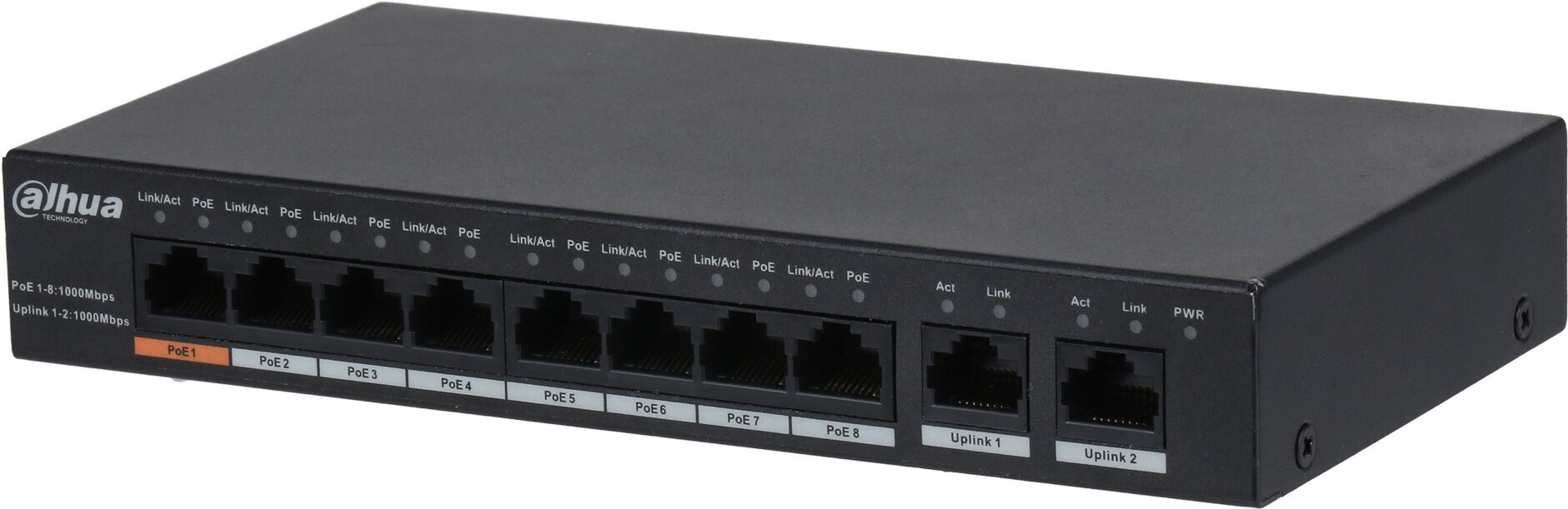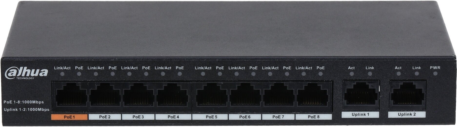 DAHUA DH-PFS3010-8GT-96 10-портовый гигабитный неуправляемый коммутатор с РоЕ, 8xRJ45 1Gb PoE, 2xRJ45 1Gb uplink, су