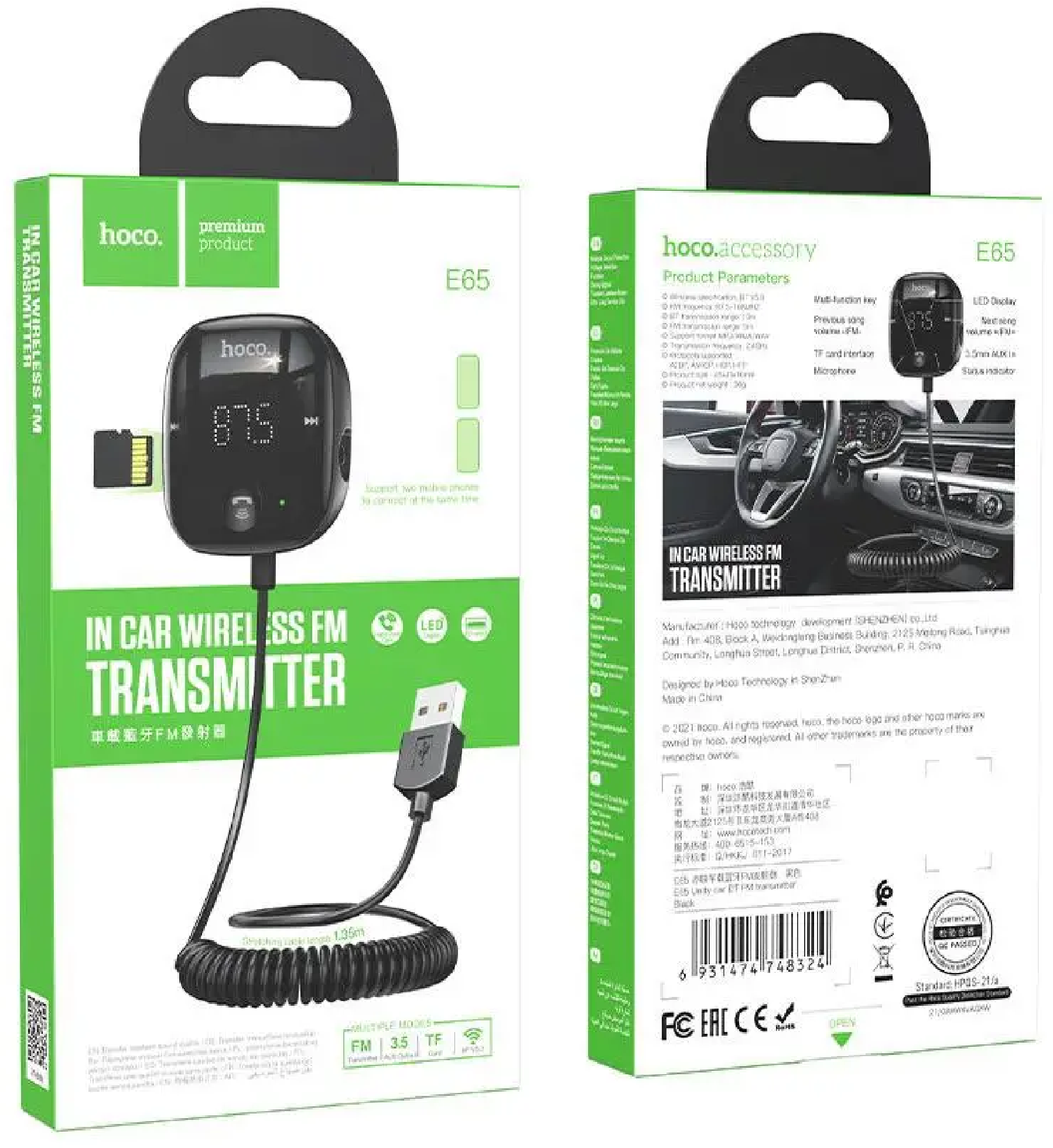 Bluetooth FM модулятор с Bluetooth подключение двух телефонов одновременно, E65, HOCO, черный информация: