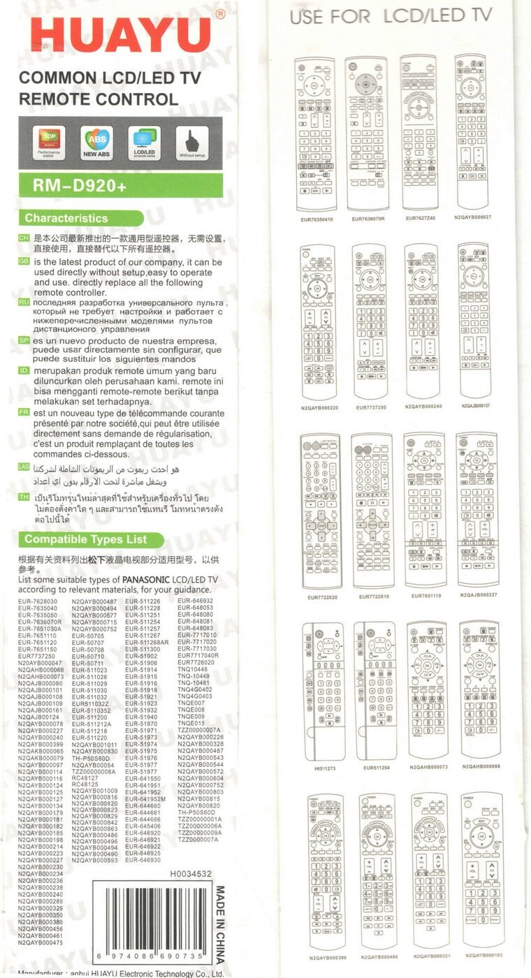 Пульт ДУ для TV Panasonic Huayu RM-D920+ универсальный информация: