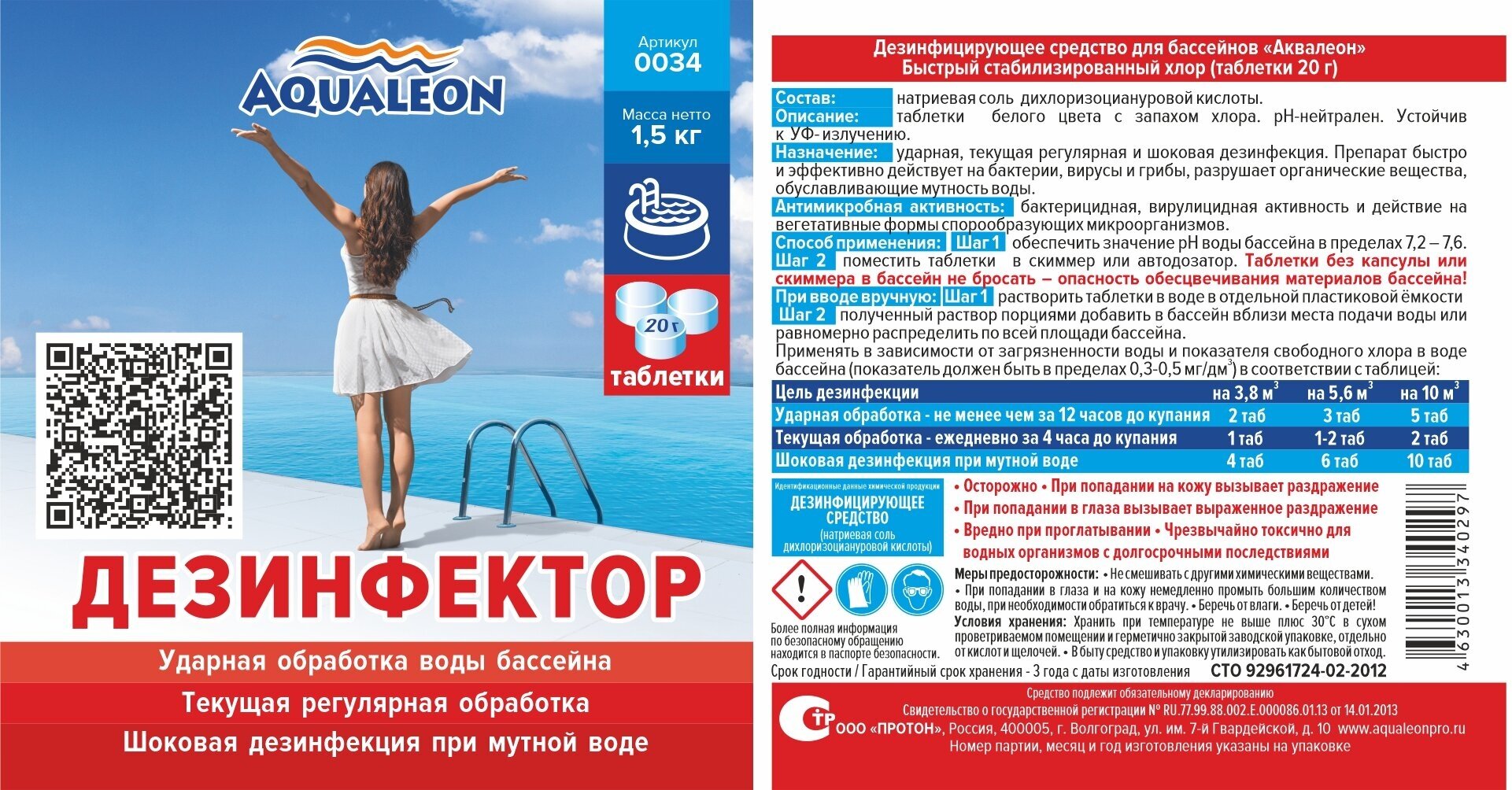 Быстрый стабилизированный хлор Aqualeon таб. 20 гр., 1,5 кг информация: