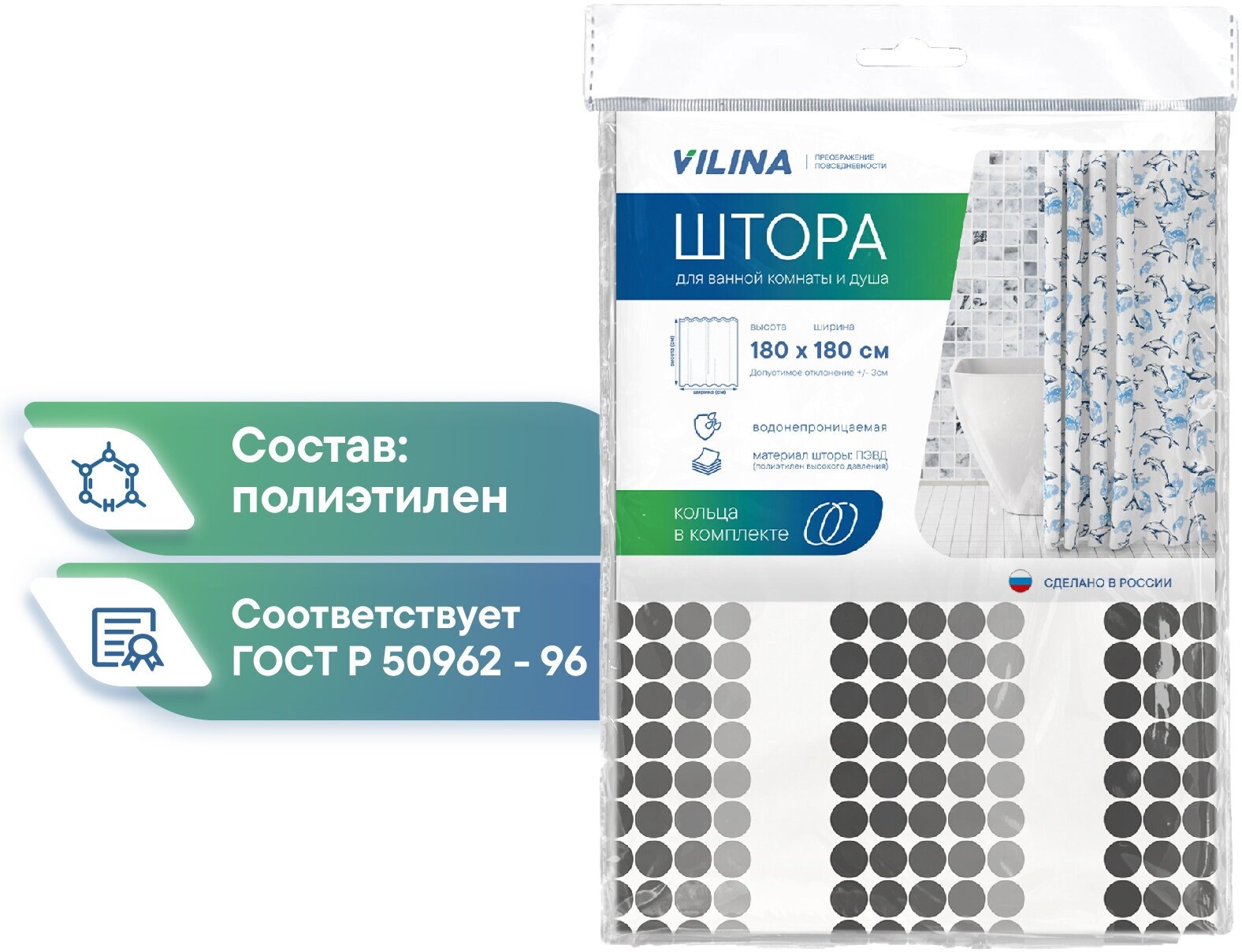 Штора для ванной комнаты VILINA водонепроницаемая с рисунком занавес с кольцами 180х180 см чёрная информация: