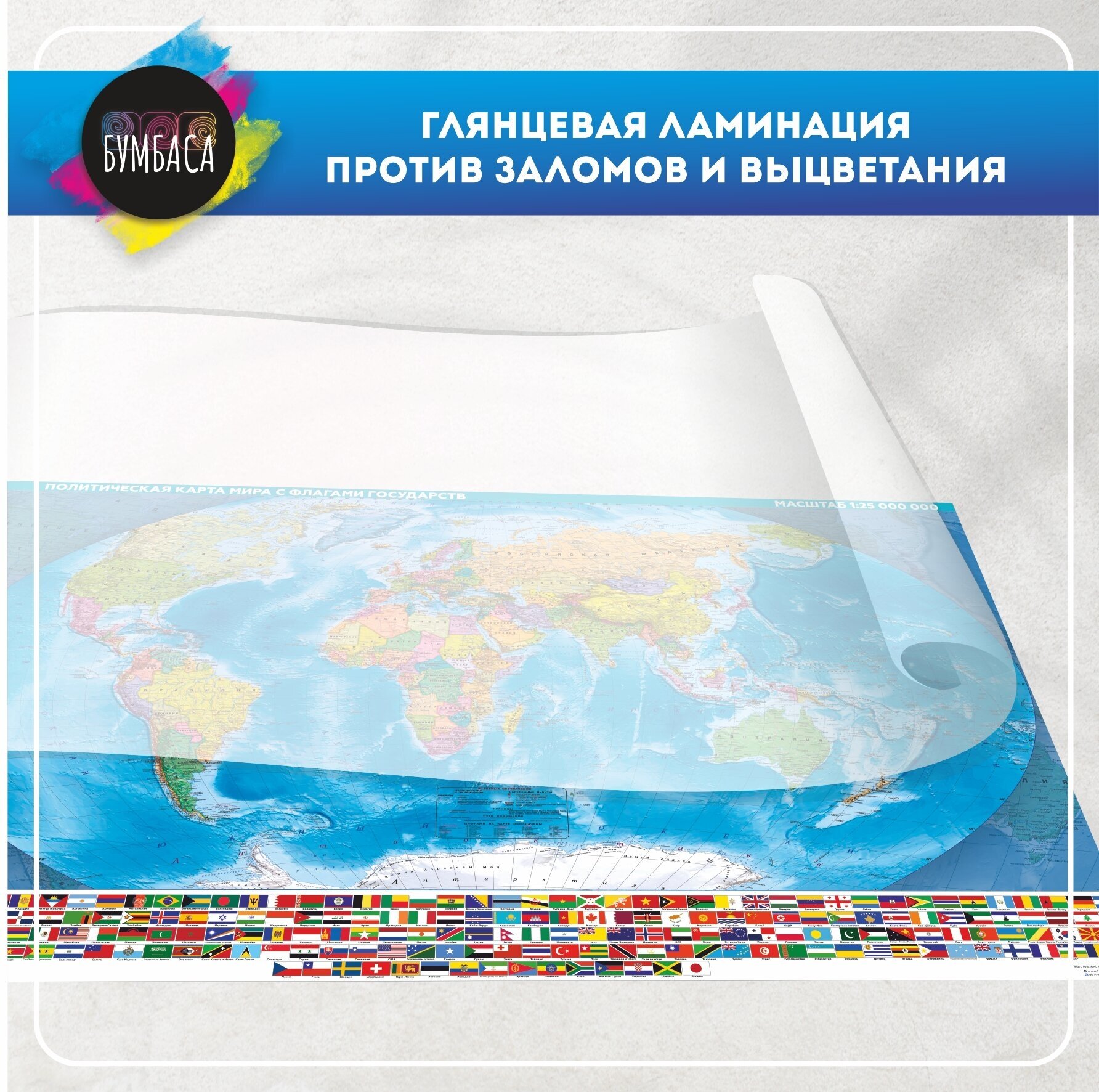 Карта Мира Настенная Ламинированная с Флагами. 130х80 см. информация: