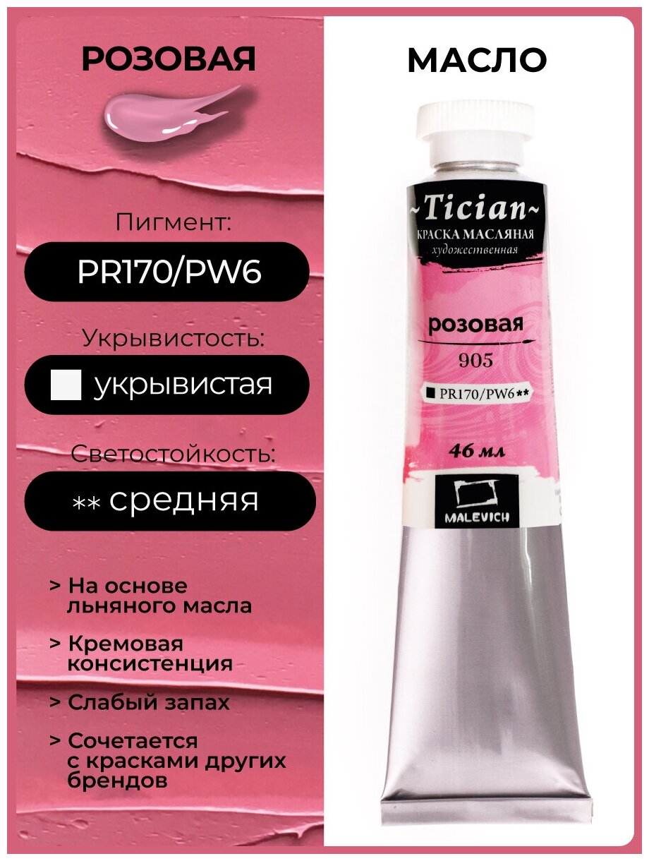 Масляные Малевичъ Масляная краска Tician малевичъ, туба 46мл, 905 Розовая