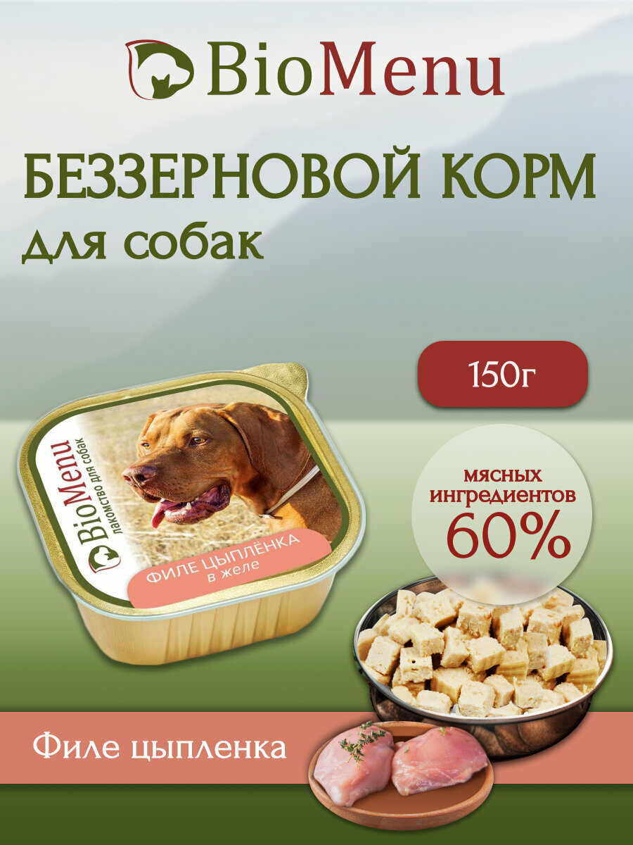 10 цен на BioMenu Консервы д/собак лакомство Филе цыпленка в желе 150гр