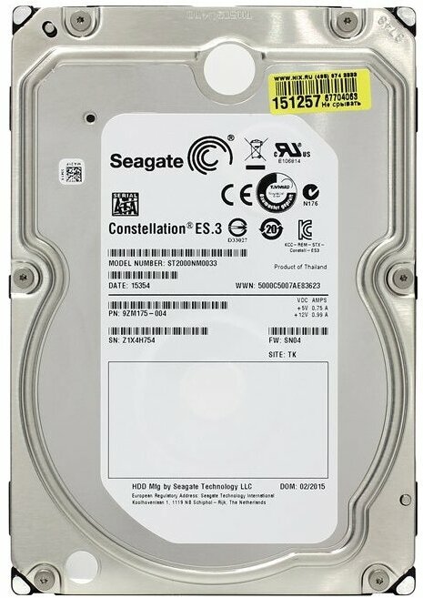 HDD Seagate SATA 2Tb Constellation ES.3 7200 6Gb/s 128Mb (clean pulled) 1 year ocs 13 840 ₽