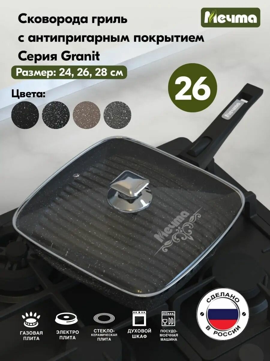 10 цен на Сковорода-гриль Мечта Гранит Black квадр. 26*26 см со съемной ручкой и стекл. крышкой арт. С066802