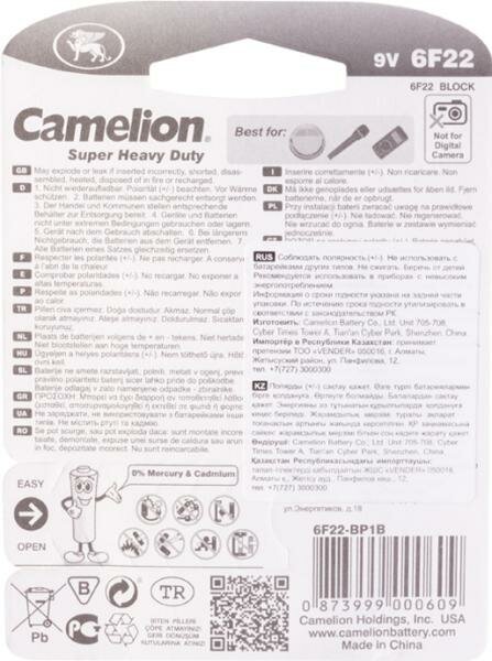 Батарейка Camelion Blue 6F22 BL-1 9В информация: