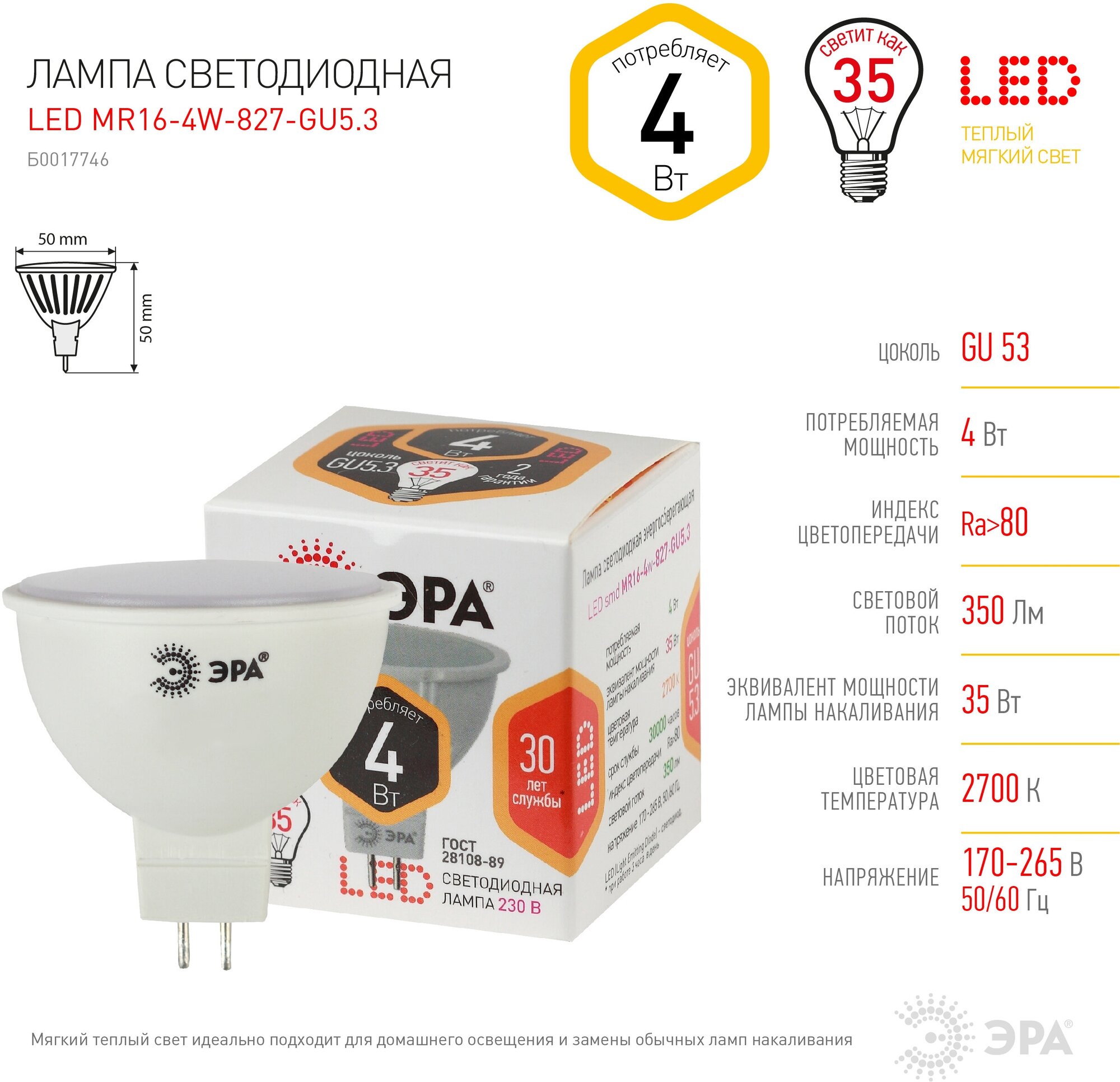 Лампа светодиодная ЭРА LED smd MR16-4w-827-GU5.3 (2 партия) информация:
