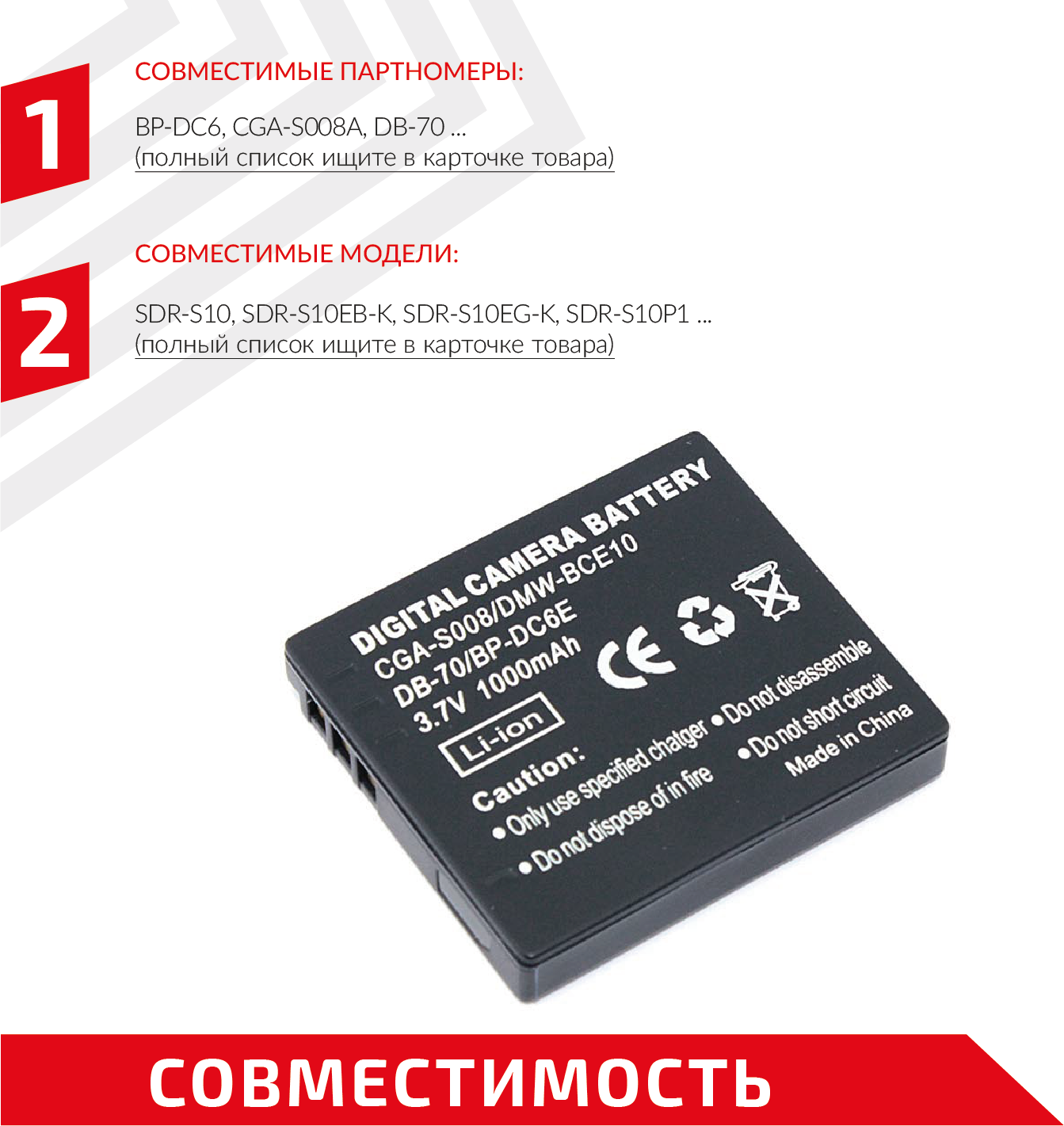 | Совместимый аккумулятор | MW-BCE10E / CGA-S008 / CGA-S008E / CGA-S008A / CGA-S008A/1B / DB-70 / BP-DC6-U / BP-DC6 / DMW-BCE10 / BP-DC6-J / VW-VBJ10 / CS-BCE10 / BP-DC6-E / VW-VBJ10E-K / CGA-S008E/1B |