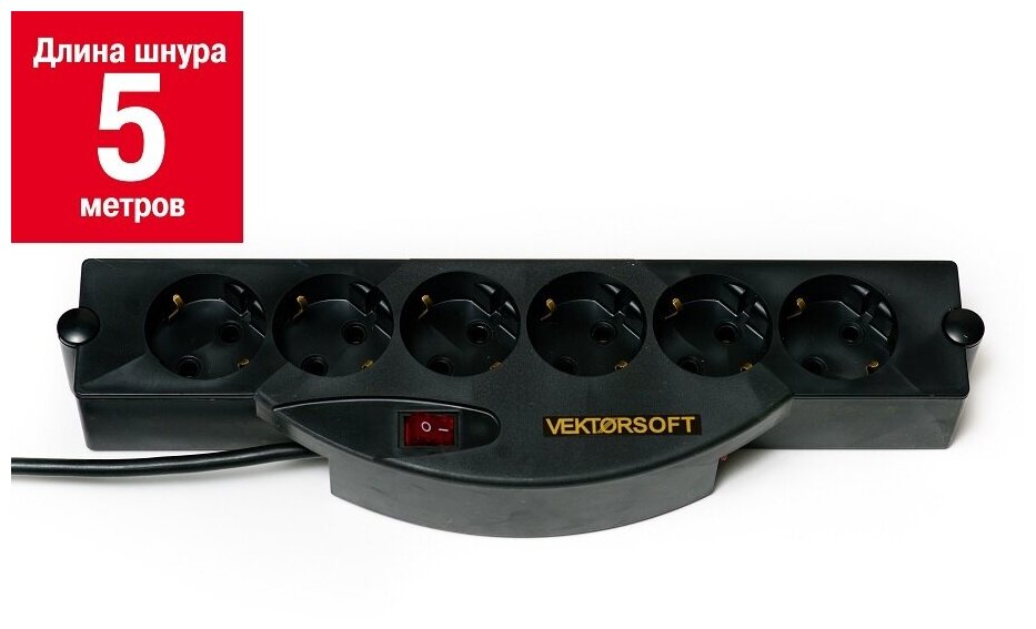 Сетевой фильтр VEKTOR SOFT, 6 розеток, с/з, 10А / 2200 Вт 5 м черный 1 371 ₽