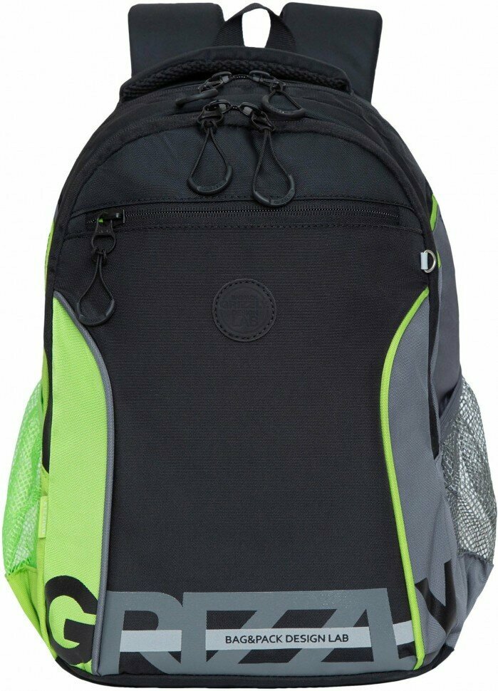 Школьный рюкзак GRIZZLY RB-259-1m черный-салатовый-серый, 27х40х16