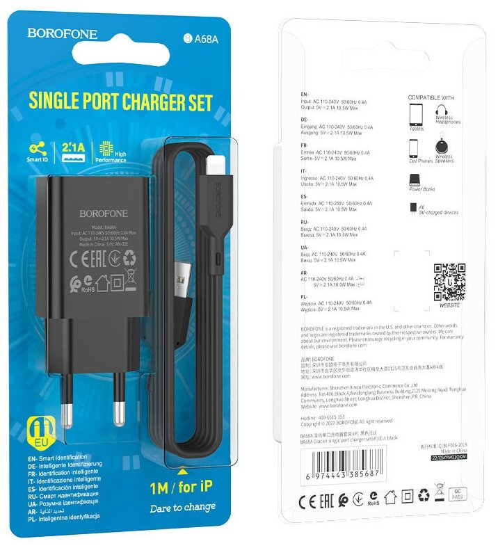 СЗУ 1USB 2.1A для Lightning 8-pin Borofone BA68A 1м Black информация: