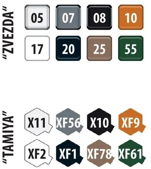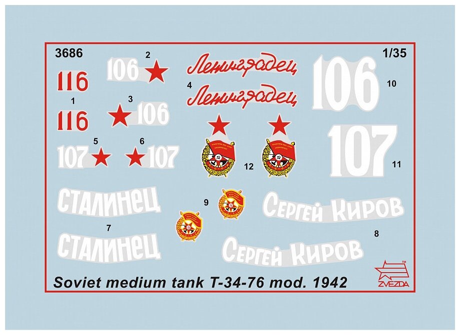 | Дополнительная информация | люки выполнены отдельными деталями; нейлоновая сетка для вентиляционных решёток, нить для имитации буксировочного троса; декаль для 3 вариантов: Т-34 №107 «Сергей Киров» из состава 1-й Ленинградской Краснознаменной танковой бригады, Ленинградский фронт январь-февраль 1943 г., Т-34 №106 «Сталинец» из состава 1-й Ленинградской Краснознаменной танковой бригады, Ленинградский фронт весна 1943 г., Т-34 № 116 «Ленинградец» из состава 1-й Ленинградской Краснознаменной танковой бригады, Красное село, январь 1944 г. |