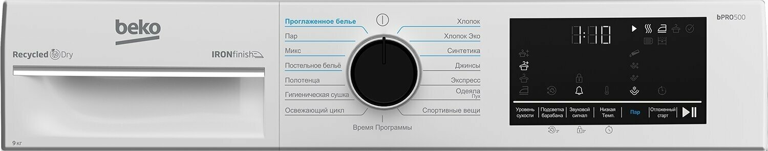 | Режимы | бережная сушка / быстрая сушка / верхняя одежда / детская одежда / джинсы / лёгкая глажка / мягкие игрушки / нижнее бельё / обработка паром / подушки / одеяла / полотенца / постельное бельё / пуховые изделия / синтетика / смесовые ткани / сорочки (рубашки) / спортивное бельё / тонкие ткани / ускоренная сушка / хлопок |