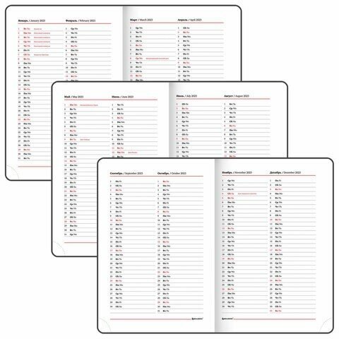 | Особенности | календарь / перфорация уголков / справочная информация / ляссе / закругленные углы |