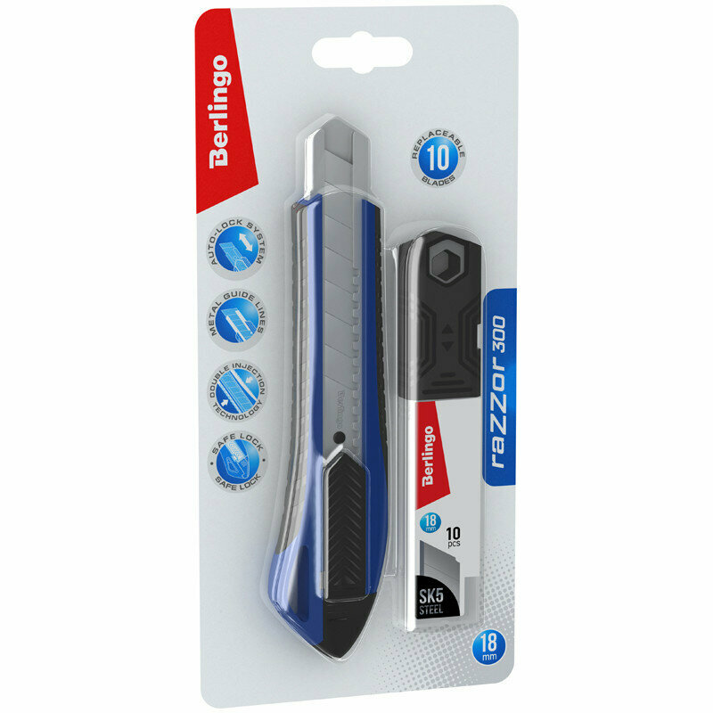 Нож канцелярский 18мм Berlingo "Razzor 300", красный + лезвия сменные 10шт., блистер, европодвес (арт. 341934)