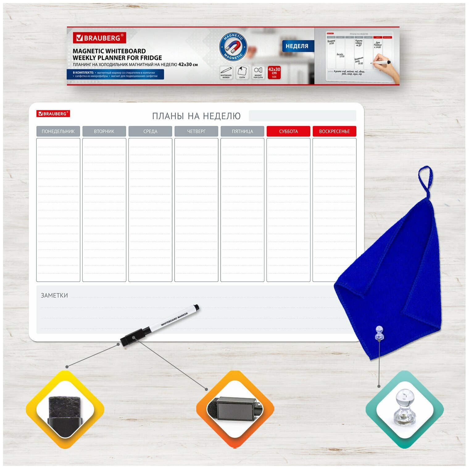 Планинг на холодильник магнитный на неделю 42х30 см, с маркером и салфеткой, BRAUBERG, 237850, 237850 578 ₽