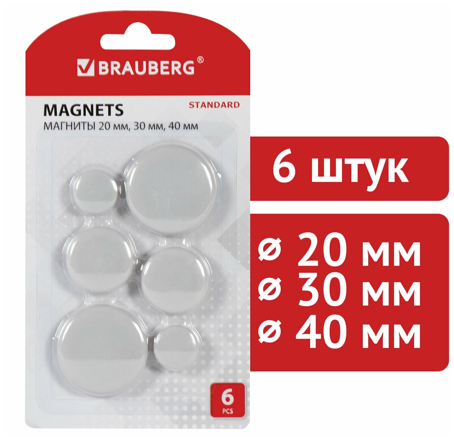 Магниты BRAUBERG "STANDARD", набор 20 мм - 2 шт., 30 мм - 2 шт., 40 мм - 2 шт., серые, BRAUBERG, 237473 - 6 шт.