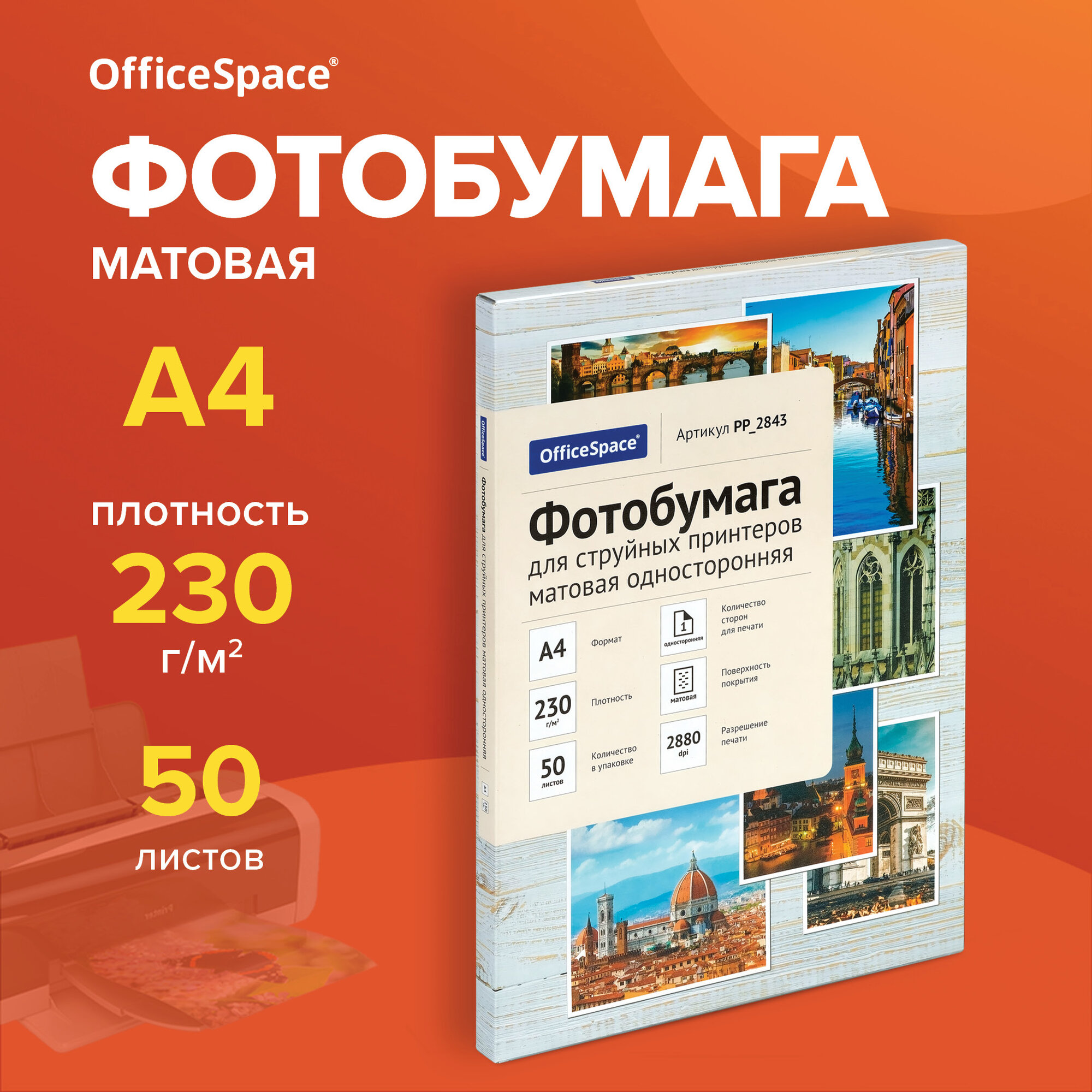 10 цен на Фотобумага для струйной печати А4, 50 листов OfficeSpace, 230 г/м2, односторонняя, матовая