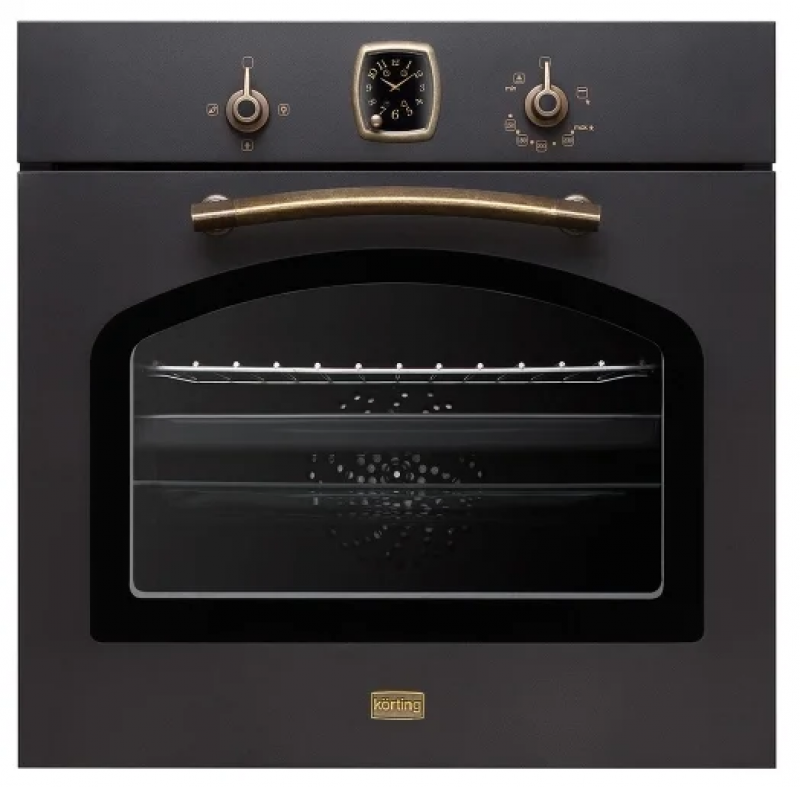 Встраиваемые газовые духовки Korting/ Газ, Retro Calabria, 59.8 х 59.5 x 56 см, газовая, газовый гриль, конвекция, таймер, телескопические направляющие, черный+бронза