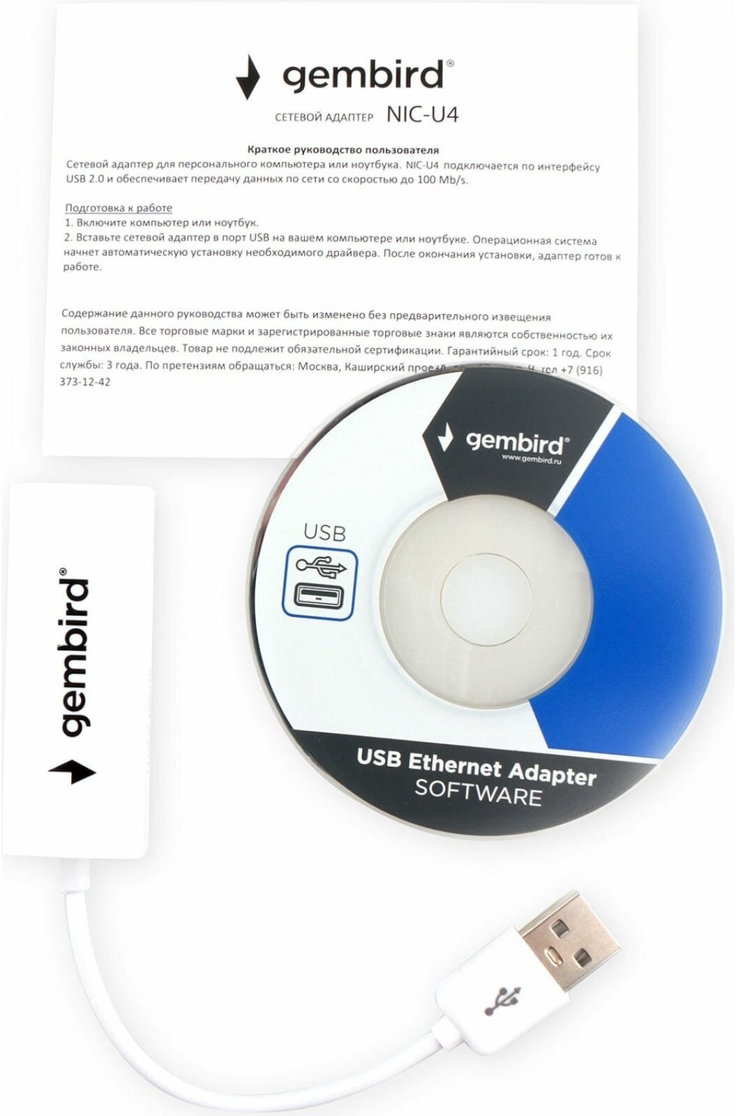 Адаптер LAN - USB Gembird NIC-U4 USB2.0 10/100 Мбит/с, портативный, белый