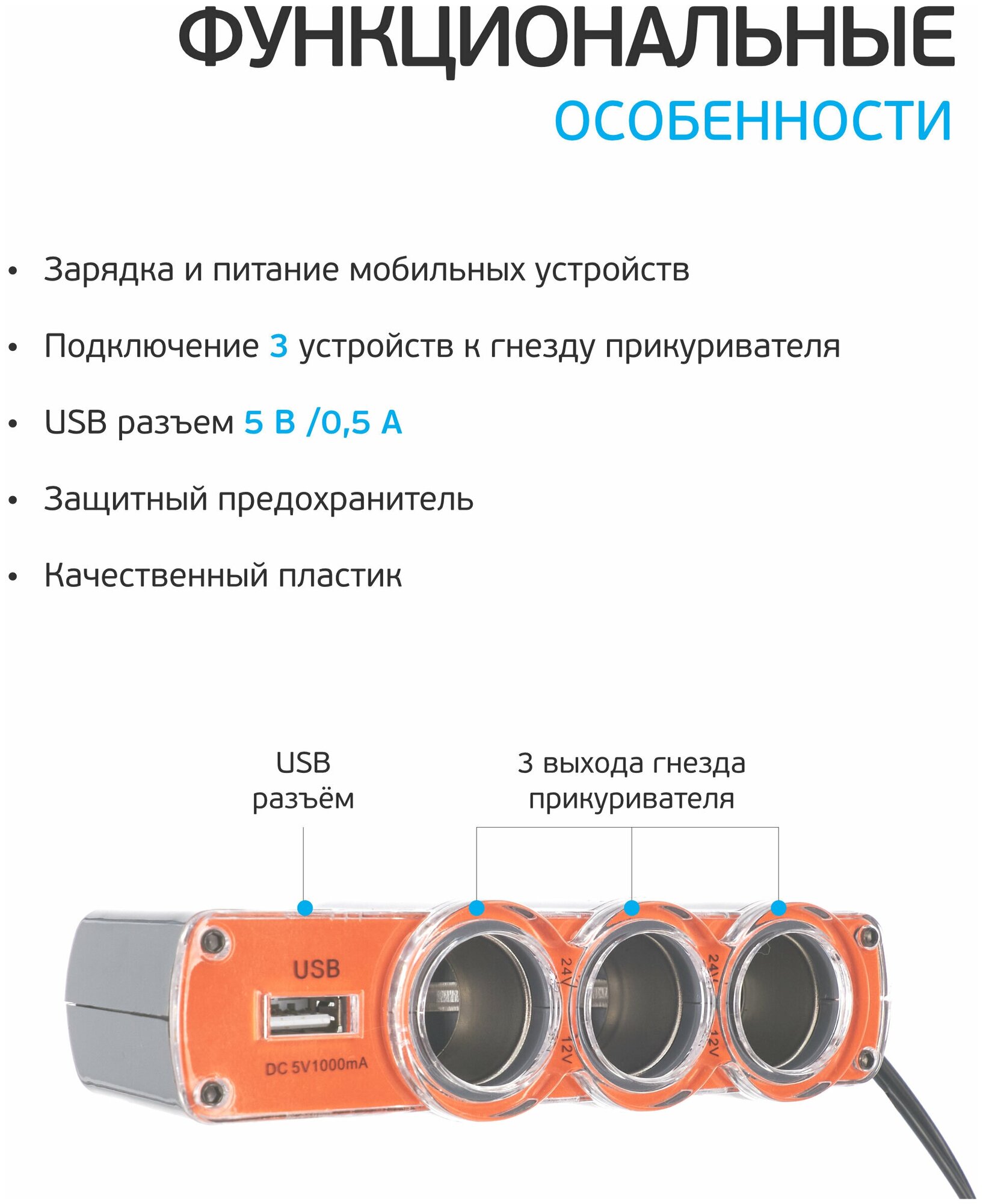 Разветвитель прикуривателя Airline, ASP-3U-03, 3 выхода, с USB, шнур 70 см, 12/24 В, 60 Вт, 5 А