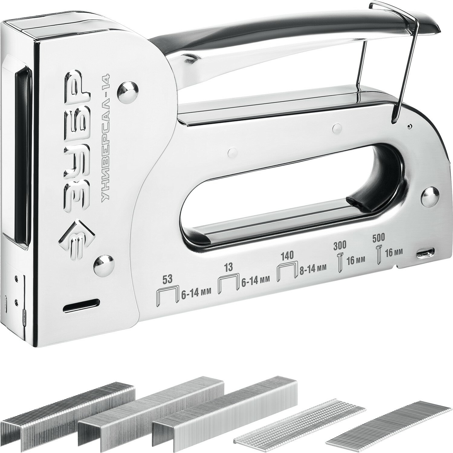 Универсальный стальной cтеплер 6-в-1: 53(6-14мм)/140(8-14 мм)/53F/13/300/500, ЗУБР Универсал-14 31527