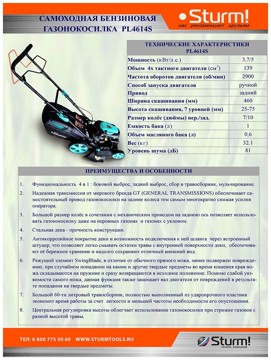 Отзывы на PL4614S Бензо-газонокосилка самоход. Sturm!,5 л.с.,нож 46 см, сбор/выброс задн.,боковой/мульча