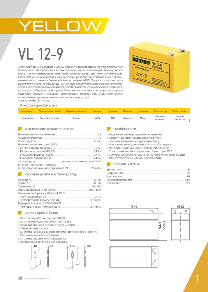 АКБ YELLOW BATTERY VL 12-9 информация: