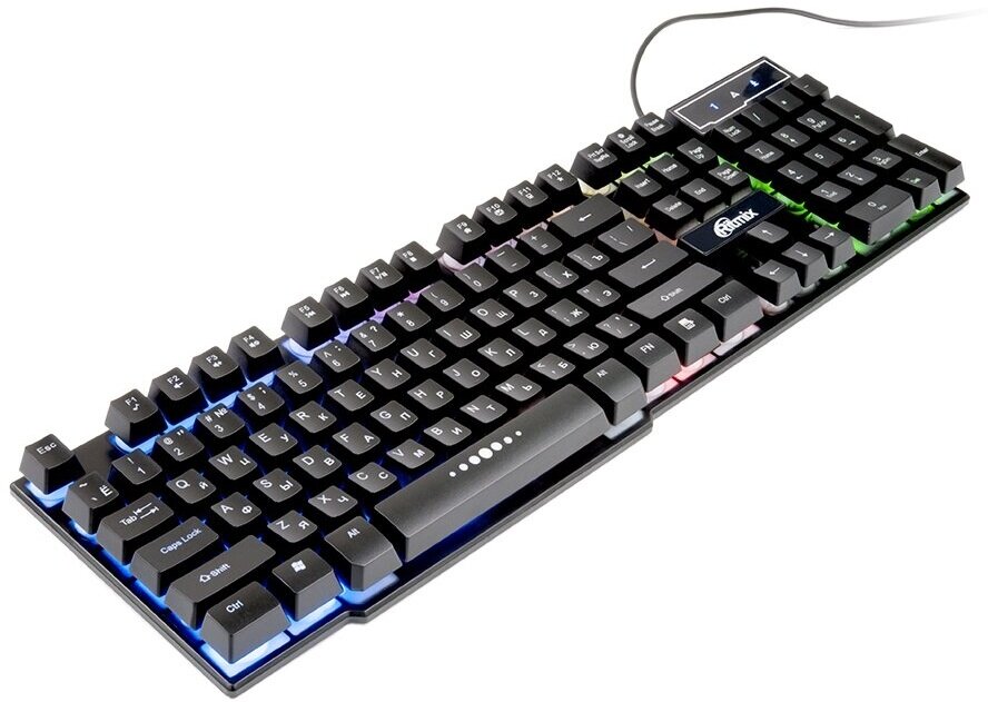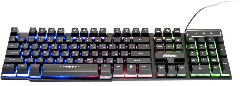 Клавиатура RITMIX RKB-200, черная, USB. Интерфейс: USB. Количество клавиш: 104+12. Длина кабеля: 150 см. Многоцветная подсветка кнопок и символов. (1/20)